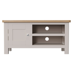 The Oakhampton Oak Small TV Unit with Glass Doors is the perfect storage solution for your DVD and Sky Box, With its chunky top, metal handles and toughened glass doors to keep little fingers off your electrical items whilst still enabling use of your remote control from the comfort of the sofa. With a fixed shelf inside and pre-cut holes for cables.