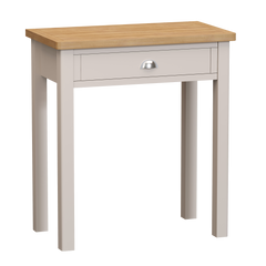 The Radnor Oak & Painted 1 Drawer dressing table is a small dressing table ideal for all types of bedroom, from spare to children's to master, a stylish well constructed piece with dovetail drawers, with a thick oak top, finished in a durable Dove Grey Paint and Classic lacquer, and highlighted with Brushed Chrome Cup handle, a perfect piece for today's modern bedrooms.