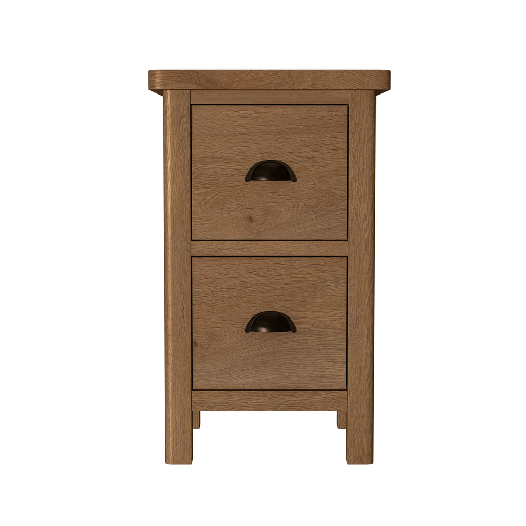 The Radnor Oak 2 drawer bedside is a bedside perfect for smaller bedrooms, or where space of a premium. Perfect for child's or spare bedroom, but still with a quality build with dovetail drawers and finished in a durable Classic lacquer, finished with a Antique style cup handle.