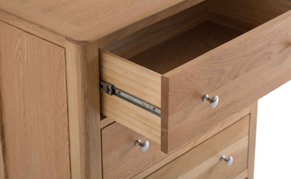 Made from Solid Oak and engineered panels with Oak and Oak veneer, manufactured to the highest of standards, finished in a durable natural lacquer, complete with Chrome and wooden knobs, to give it a stunning and unique style of its own.