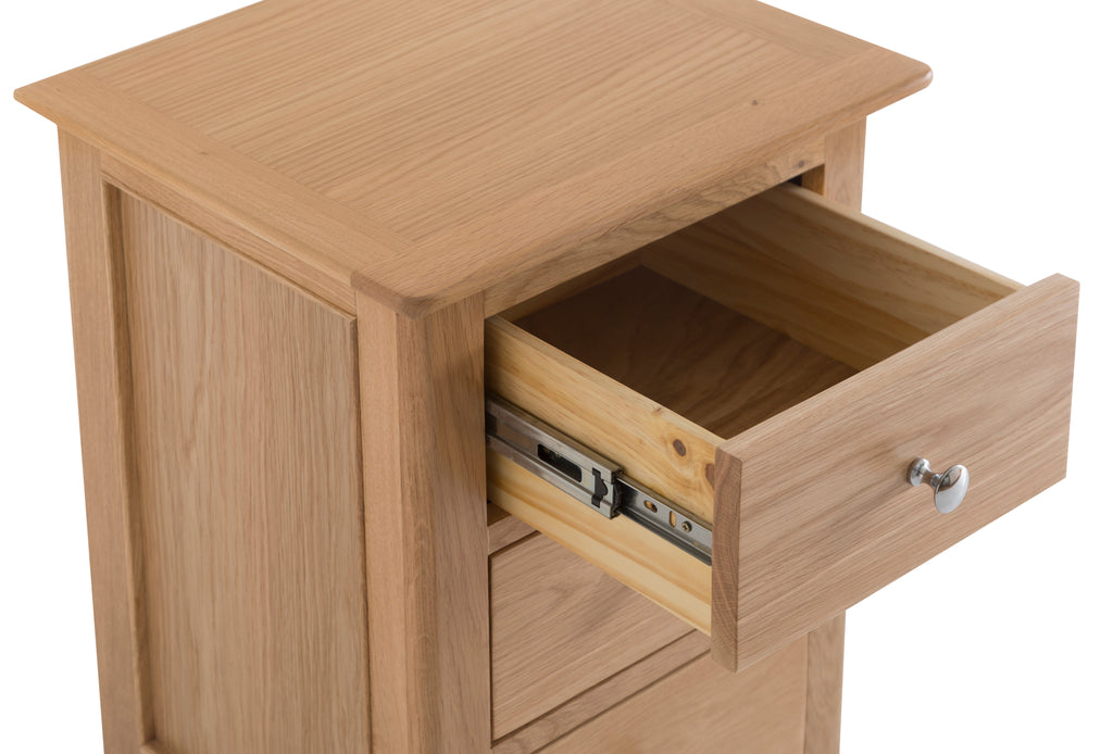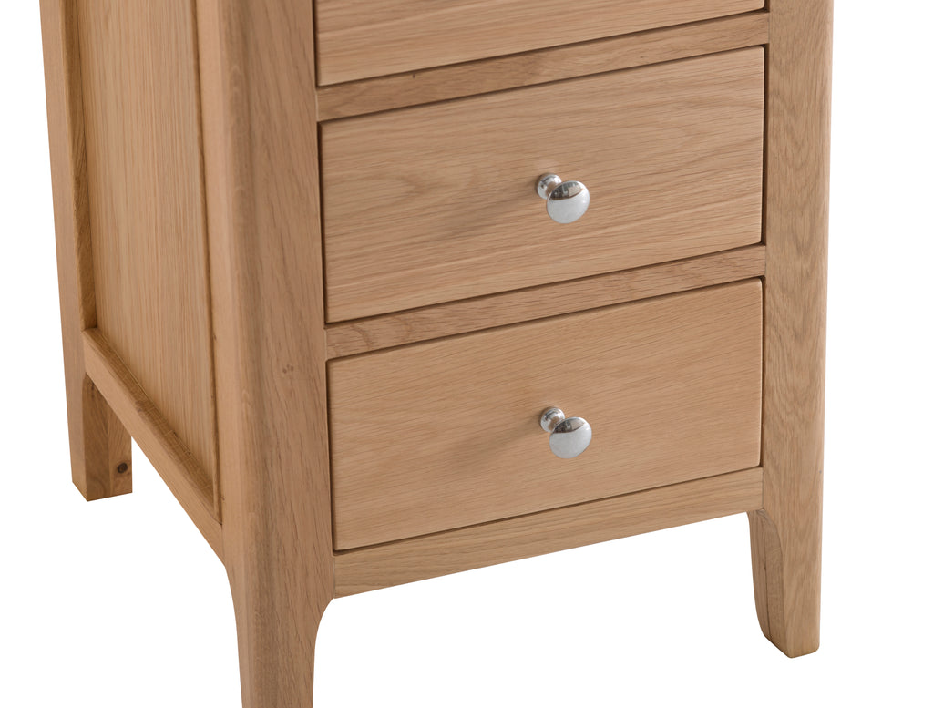 The Oslo Oak 3 Drawer Large Bedside is a Scandinavian inspired design 3 drawer bedside complimented by its beaded panels, its deep bevelled top and its simple but classic Durable Natural lacquer finish. The bedside comes with a choice of modern Chrome knobs or traditional Wooded Knobs, both supplied as standard at no extra cost. This stunning Large bedside is ideal for any bedroom or a Master bedroom.