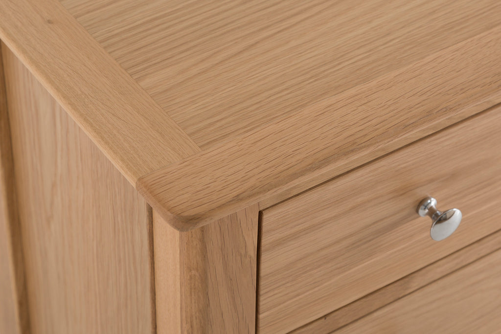 Made from Solid Oak and engineered panels with Oak and Oak veneer, manufactured to the highest of standards, finished in a durable natural lacquer, complete with Chrome and wooden knobs, to give it a stunning and unique style of its own.