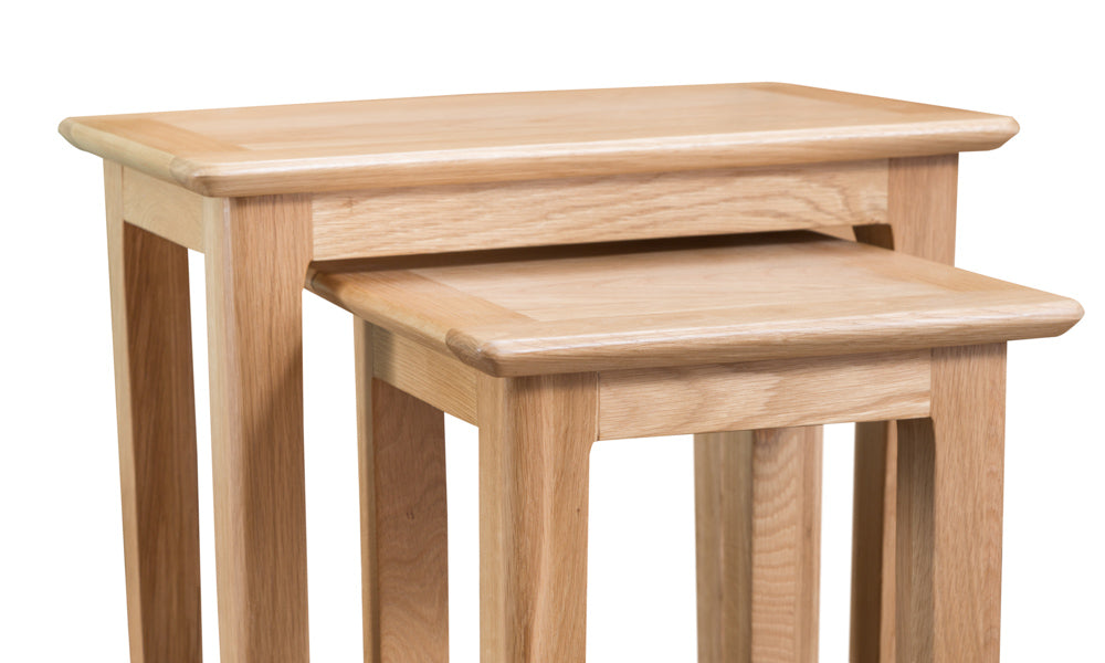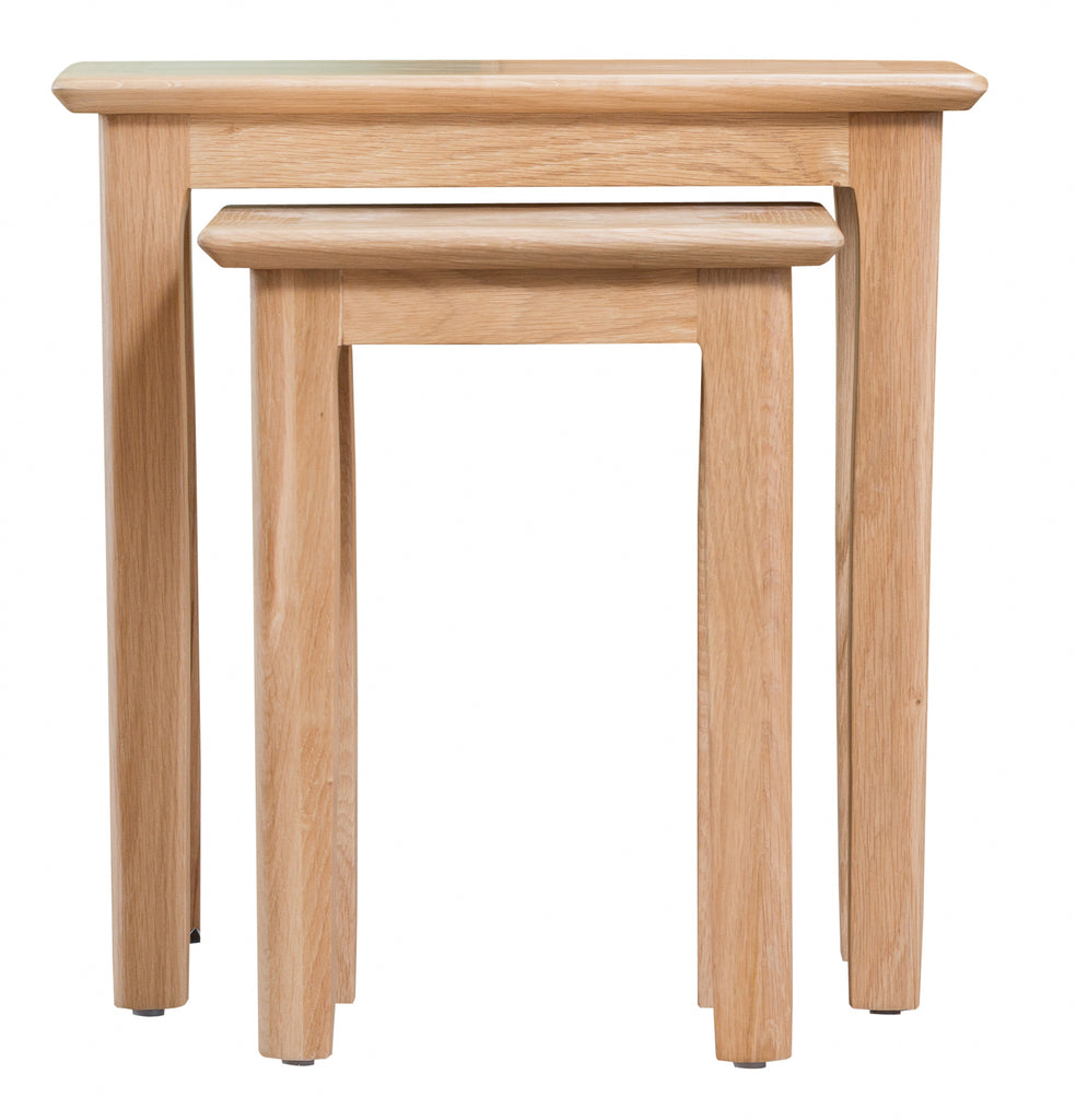The Oslo Oak Small 2 Nest of Tables is a perfect small nest for the occasional coffee with friends and the quick snack in front while watching your favourite TV program. This classic Scandinavian styled nest is functional and stylish, with its soft curves and bevelled top. Comes with Teflon feet to protect your flooring.