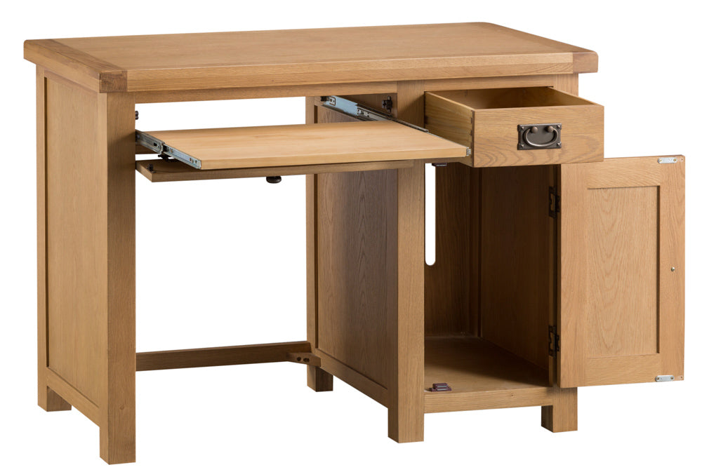 The Oakhampton Oak Computer Desk is a solid thick top computer desk, with metal handles and a ball bearing runner slider for the keyboard pull out tray which is neatly hidden behind a drop down drawer. The cupboard is the ideal size for a computer tower while the drawer is ideal for keeping all those leads that go with any computer system.