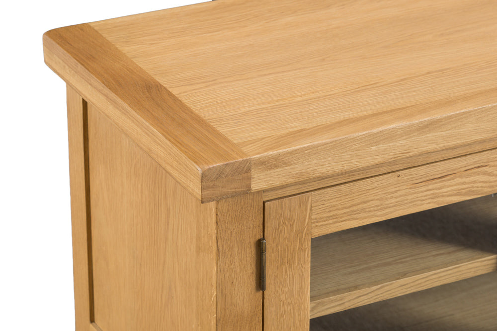 The Oakhampton Oak Small TV Unit with Glass Doors is the perfect storage solution for your DVD and Sky Box, With its chunky top, metal handles and toughened glass doors to keep little fingers off your electrical items whilst still enabling use of your remote control from the comfort of the sofa. With a fixed shelf inside and pre-cut holes for cables.