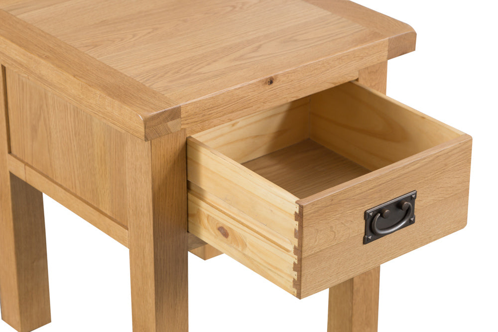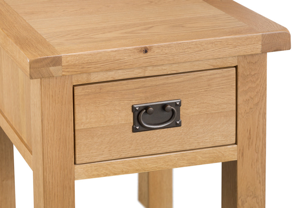 Oakhampton Oak Lamp Table Drawer is a ideal piece for the smaller room or smaller space, with its thick top and rustic look with a natural lacquer finish it is a perfect storage or lamp table for any corner.