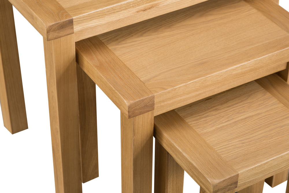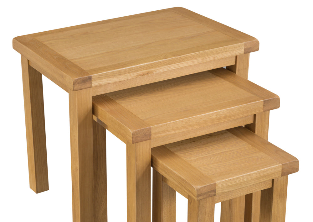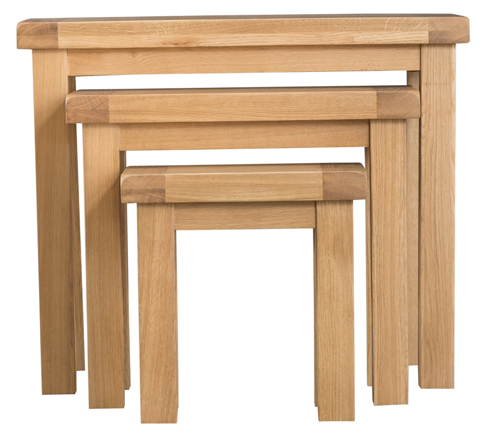 Oakhampton Oak Nest 3 Tables with its chunky top and rustic look, is a stylish addition to living room and its small size makes it perfect for the smaller room, with the addition of a third table for that unexpected guest.