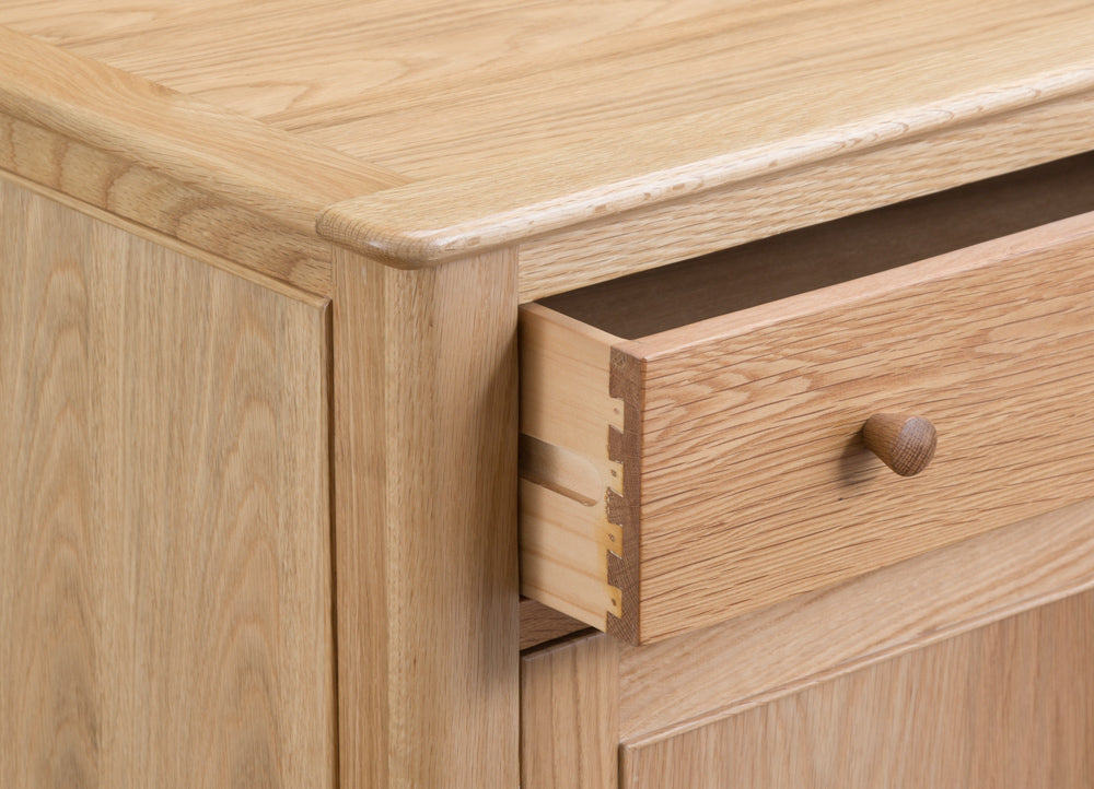 The Oslo Oak Small Sideboard with Drawer, is a great storage solution for the smaller space and when combined with the Oslo Oak Small Dresser Top it is a great display and storage solution. The 2 drawers are perfect for storage of smaller items and are dovetailed with solid wooden drawer bottoms. The 2 cupboards come with a shelf to help maximise your storage.